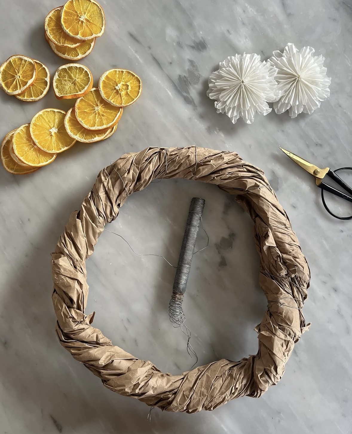 Själva stommen gjorde jag av tvinnat papper som jag formade till en ring. Sedan använde jag en tunn ståltråd för att fästa mossan runt hela formen. Det är verkligen hur lätt som helst, och resultatet blir både rustikt, naturligt och väldigt juligt.