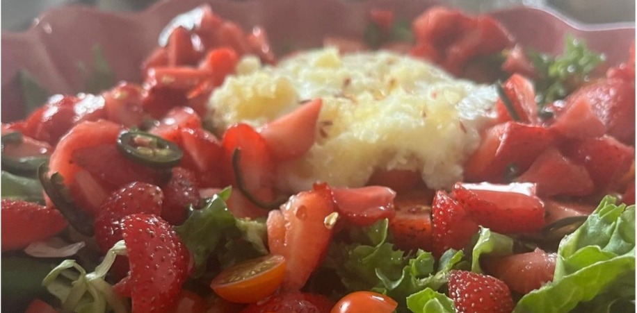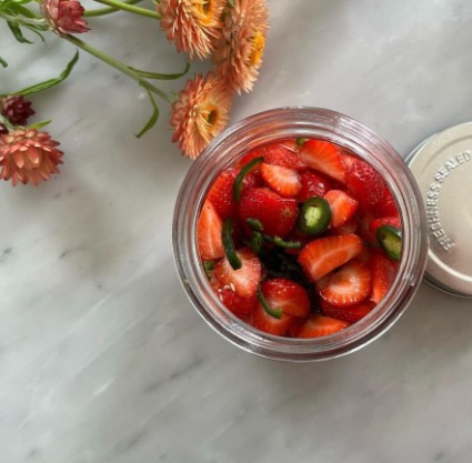 Koka upp lagen och låt svalna. Halvera jordgubbarna och häll lagen över i en burk. Ställ i svalt i kylen. Använde sedan machesallad, tomater och färska jordgubbar till min förrätt. Sedan toppa med Burrata, de picklade tomaterna och jalapeno. Sedan olivolja och chiliflakes. klart!